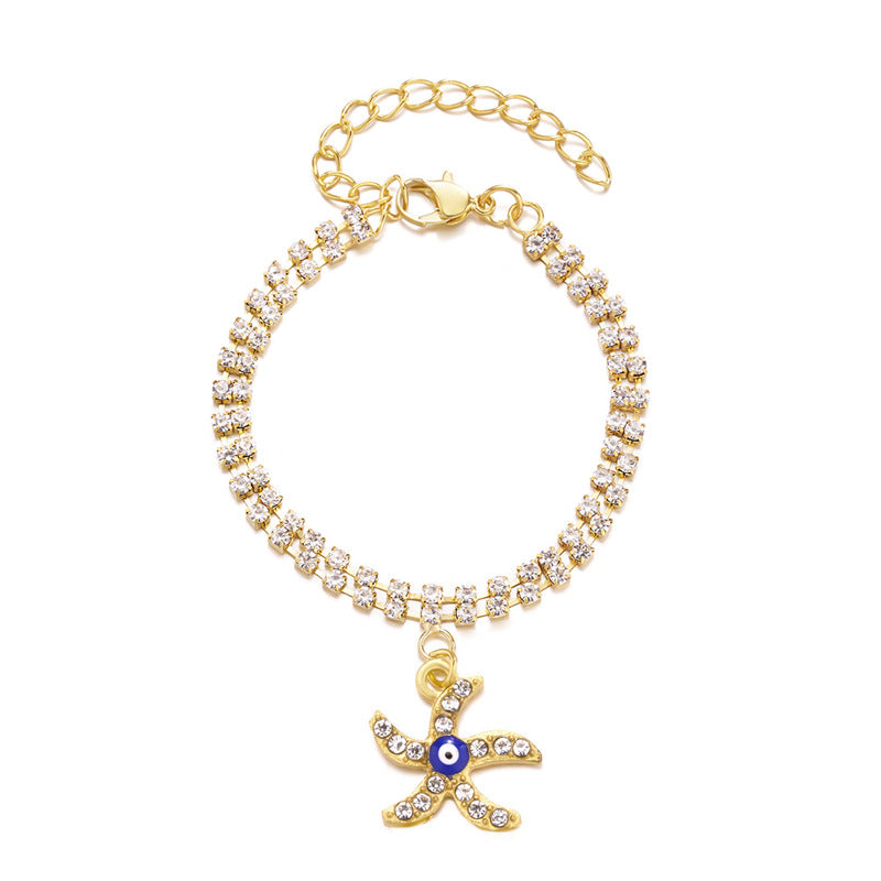 Adjustable Double-Layer Crystal Bracelet with Blue Eye & Starfish Design - Trendy Jewelry Gift for Women