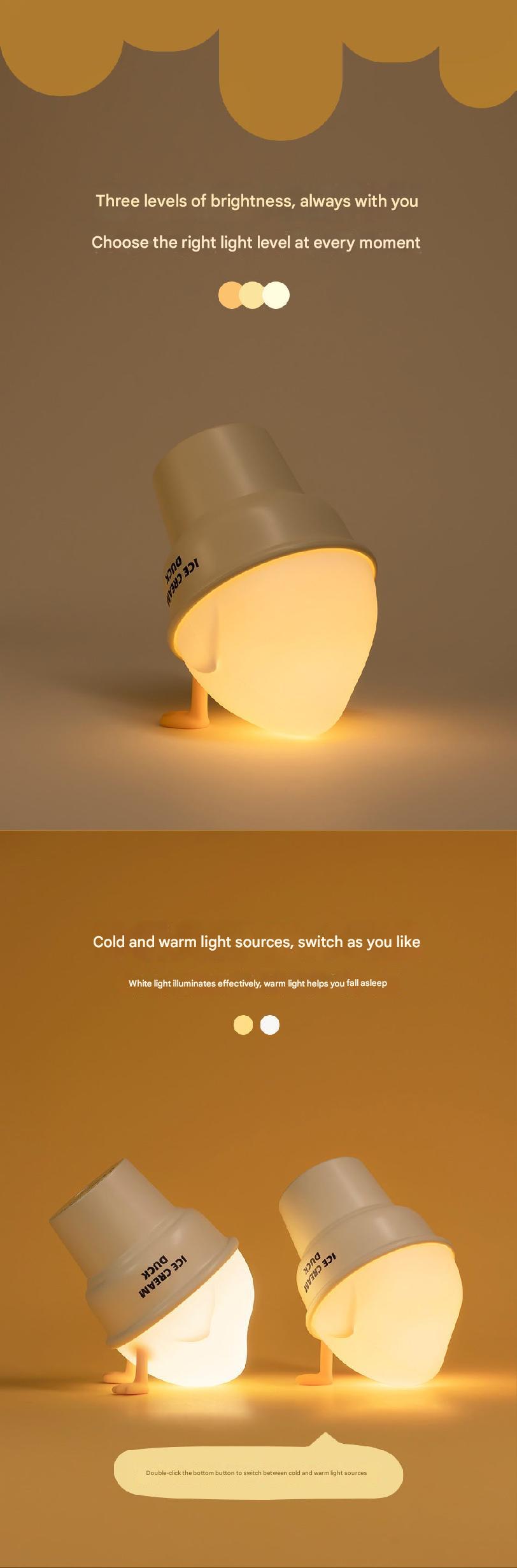Illuminate your space with a touch of charm using our Cartoon Soft Glow Bedside Lamp. Designed to resemble a delightful ice cream cone, this lamp offers touch-activated light modes that adjust from a warm, soothing glow to bright white light with just a simple tap. Ideal for both children and adults, it creates a comforting atmosphere in any room. The lamp is made with durable ABS material, ensuring it's safe and long-lasting. It's rechargeable and portable, making it easy to move and ideal for travel. Its 1W LED light is not only bright but also energy-efficient, ensuring that it's cost-effective. This cute and versatile lamp is an excellent choice for a night light, a decorative piece in a child's playroom, or as a unique gift for any occasion.