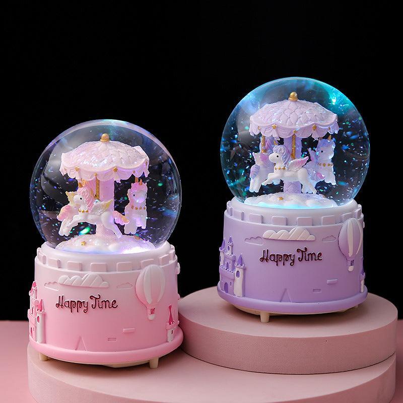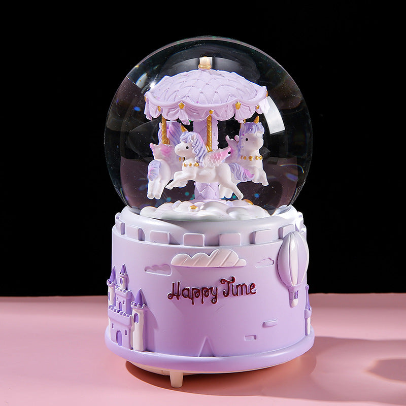 Transform any room into a magical space with our Carousel Crystal Globe Music Box. This beautifully crafted item combines the nostalgic charm of a classic carousel with the enchanting beauty of a crystal globe. It features a meticulously hand-painted resin structure that ensures longevity while showcasing intricate artistry. Choose between various sizes and colors to find the perfect match for your decor or gifting needs. Whether celebrating a birthday, holiday or special occasion, this music box is the go-to choice. Its automatic snow drift feature complements the ambient lighting and soothing tunes, creating a mesmerizing visual and auditory experience that captivates anyone.