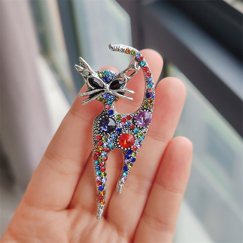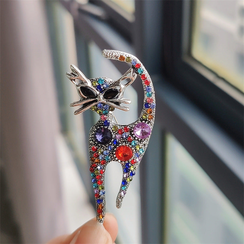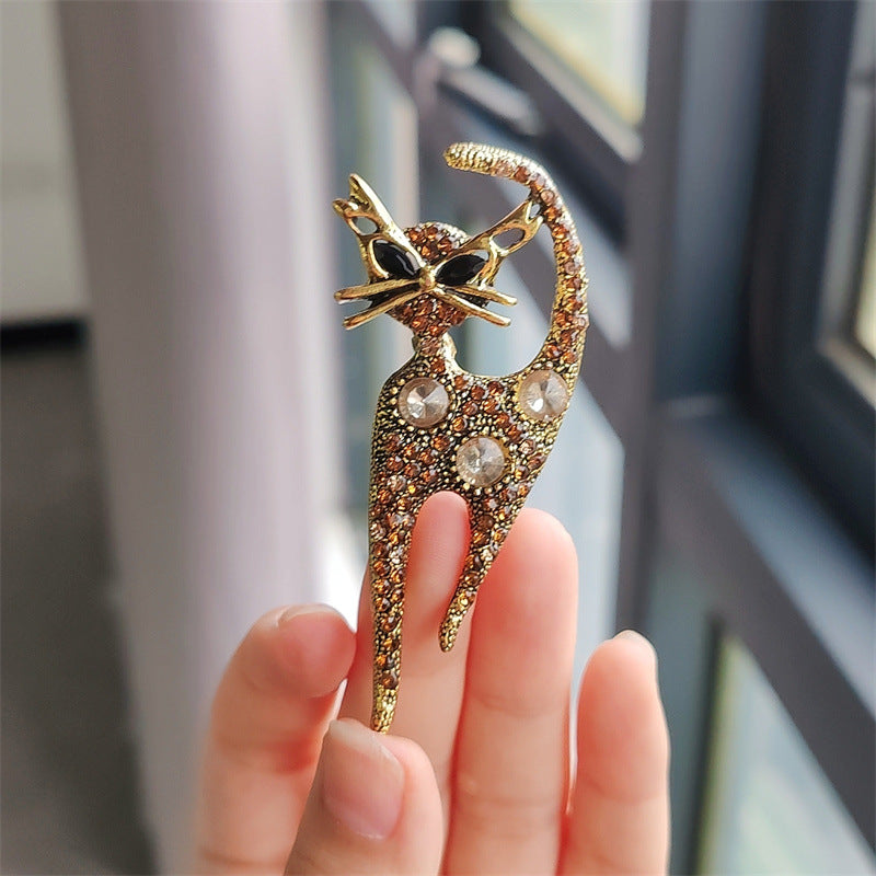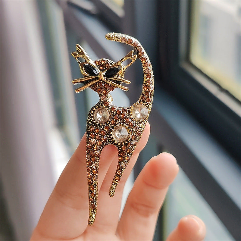 Charming Retro Cat Brooch – Stylish Rhinestone Cat Pin for Fashionable Outfits