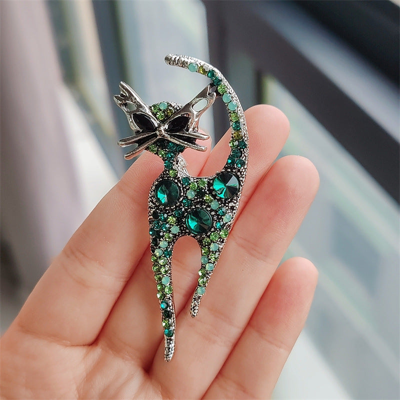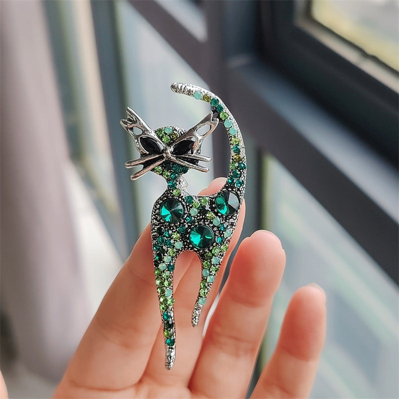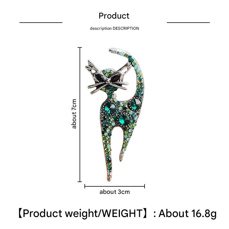 Discover the enchanting retro cat brooch, an essential accessory that adds a delightful touch to any outfit. This stylish pin features intricate detailing and glimmering rhinestones, making it a perfect statement piece. Available in a variety of captivating colors such as green, champagne, and vibrant patterns, you can effortlessly coordinate it with different styles and occasions. Whether you're dressing up for a night out or adding flair to your everyday look, this cat pin is the ideal versatile companion. Its durable alloy construction ensures that it will remain a cherished part of your jewelry collection for years to come. Plus, it makes for a purr-fect gift for cat enthusiasts and fashion lovers alike!