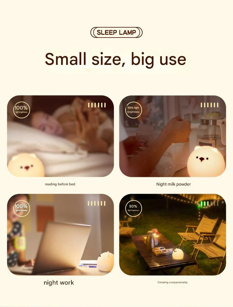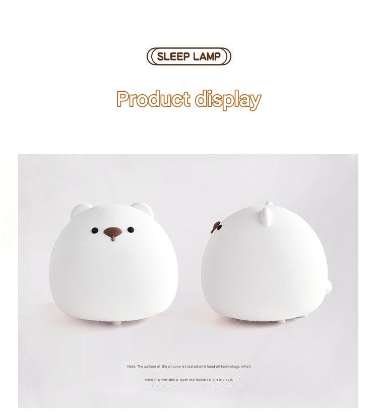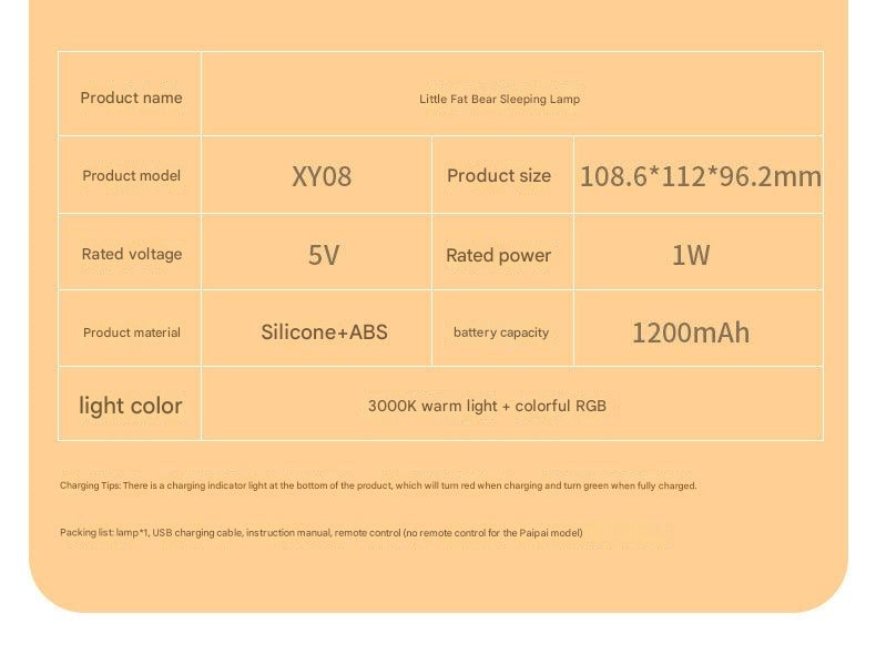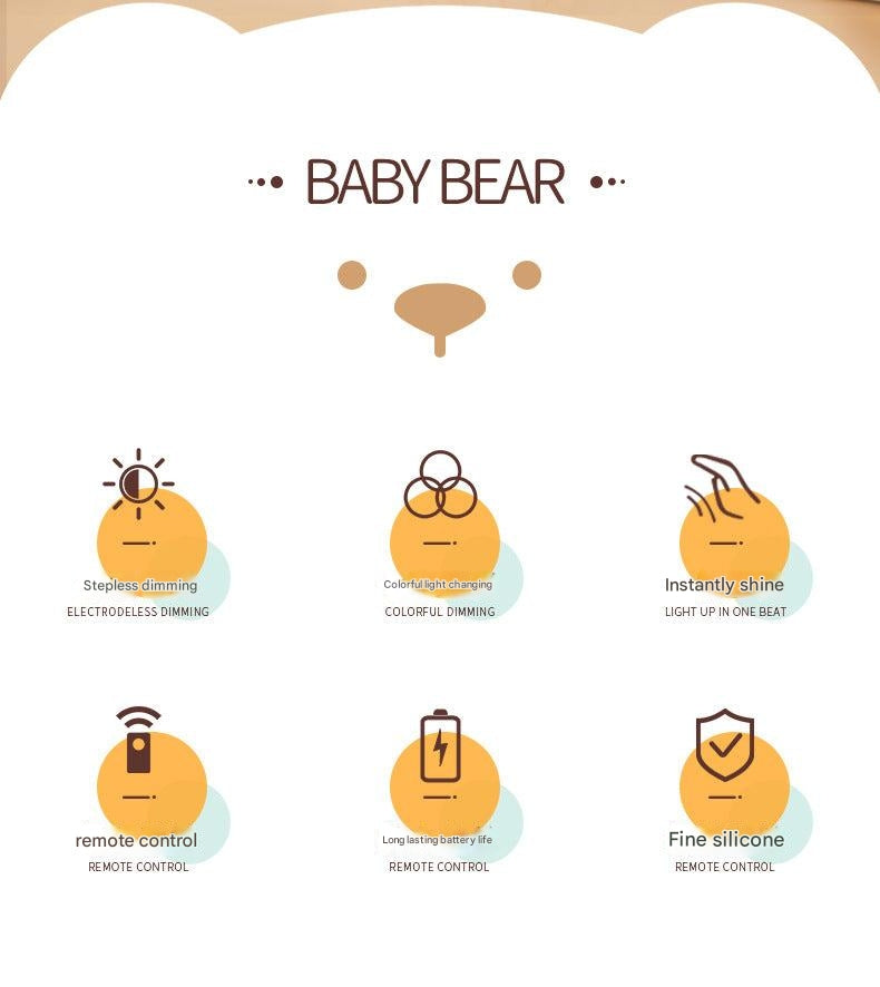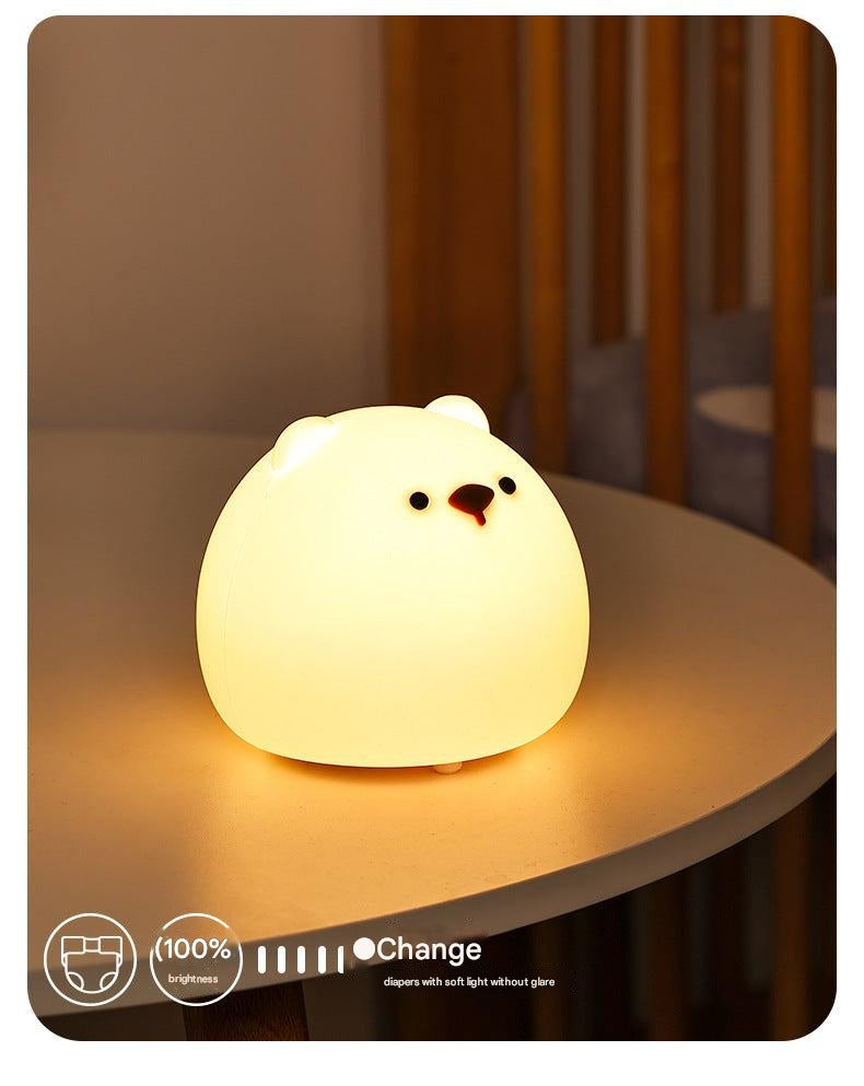 Enhance your nighttime experience with the Chubby Bear Silicone Night Light. Crafted from safe and durable silicone, this adorable, touch-sensitive lamp is perfect for adding a warm glow to any bedroom. Its user-friendly design allows you to easily tap to switch between a range of beautiful colors, making it not just a light, but also a delightful decorative piece.