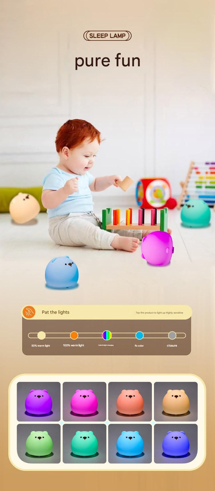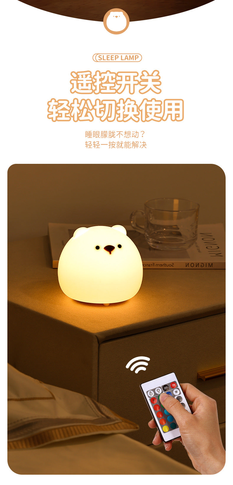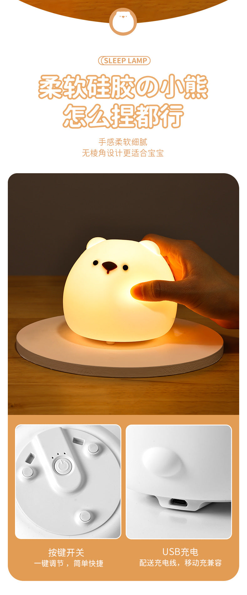 Enhance your nighttime experience with the Chubby Bear Silicone Night Light. Crafted from safe and durable silicone, this adorable, touch-sensitive lamp is perfect for adding a warm glow to any bedroom. Its user-friendly design allows you to easily tap to switch between a range of beautiful colors, making it not just a light, but also a delightful decorative piece.