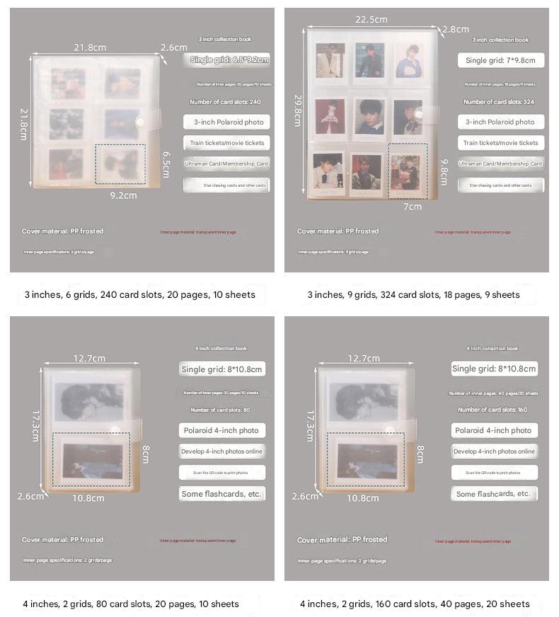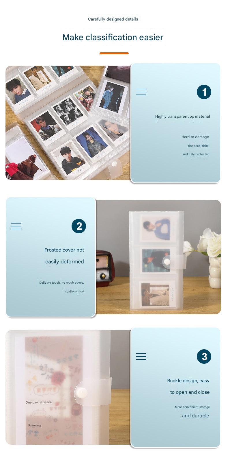 This versatile instant photo album is meticulously designed for photo enthusiasts and collectors. Whether you are a fan of star-chasing or love capturing every moment during travel, our photo album is tailored for you. Choose from various sizes and styles to fit standard photo sizes such as 3x3, 4x4, 5x5, and 6x6 inches. Each album includes 20 pages with multiple configurations from 60 to 324 photo card slots, ensuring ample space for all your favorite memories. Its durable PP cover and practical snap closure system will keep your pictures secure. Ideal for personal use or as a unique gift, these photo albums serve multi-functional purposes, making them a must-have item for anyone who loves organizing and preserving their memories in style.