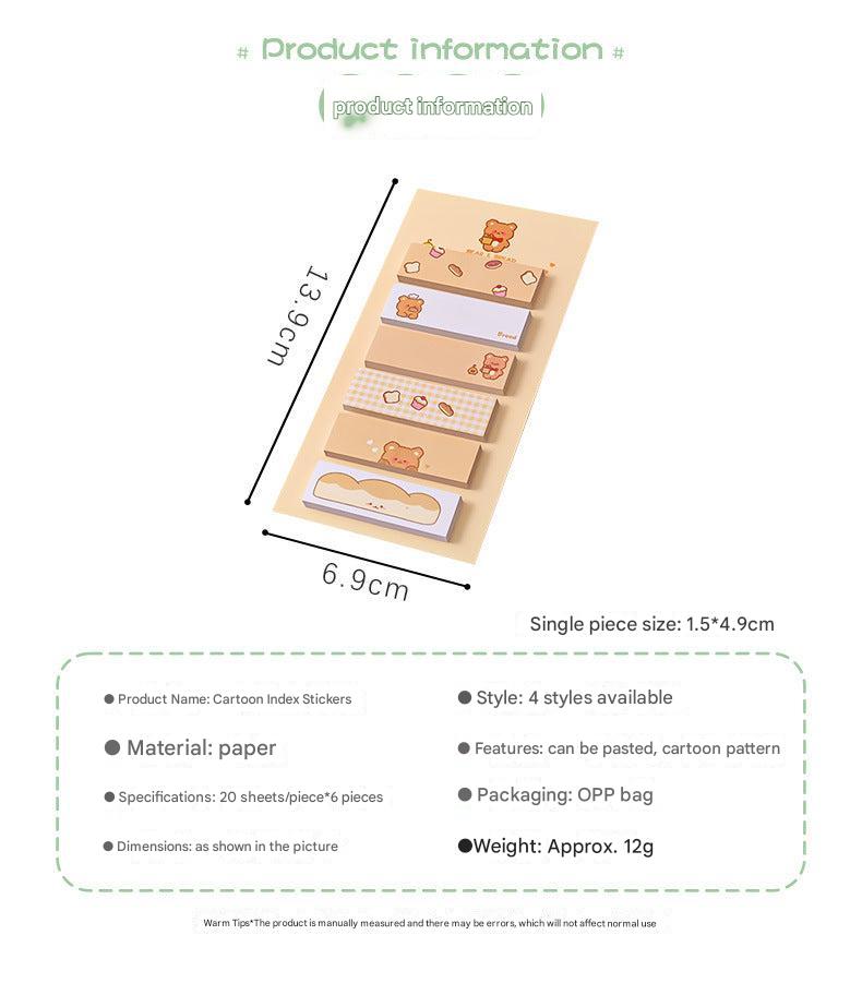 Keep your notes organized and your workspace fun with our Cute Cartoon Sticky Notes. Perfect for students, professionals, and anyone in between, these sticky notes come in various adorable designs. Each pad is crafted from high-quality, eco-friendly paper, safe for both you and the environment. The pads include 6 sheets with 20 notes each, providing ample space for all your reminders, to-do lists, and quick memos. Easy to stick and remove without damaging your documents or walls, our sticky notes are indispensable for efficient message leaving and creative expression.