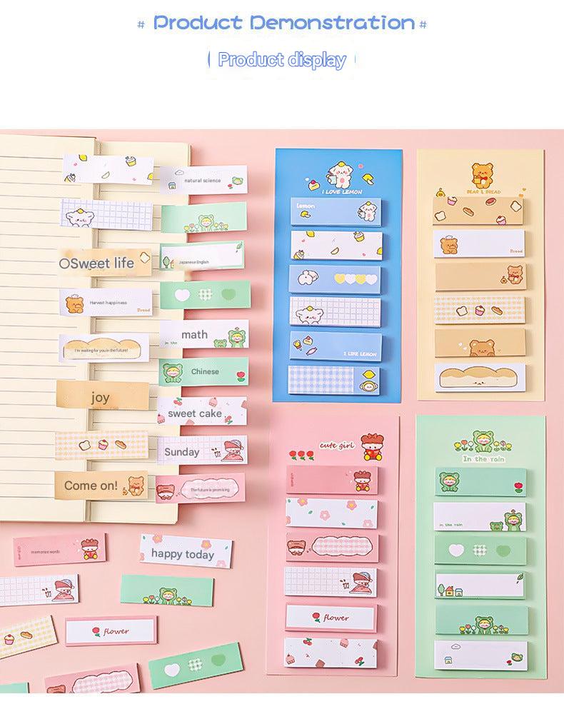 • Adorable Cartoon Designs: Brighten up your day with lively cartoon-themed sticky notes featuring characters like Dialogue Girl, Lemon Dog, Dessert Bear, and Rain Frog.