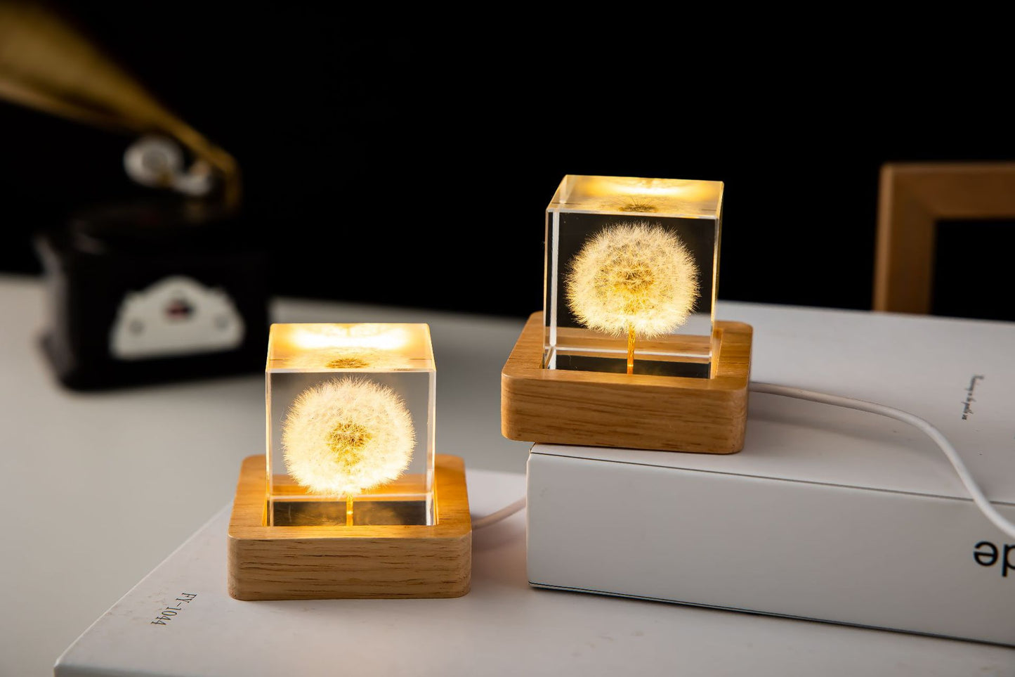 3D engraved dandelion in crystal ball night lamp with wooden base