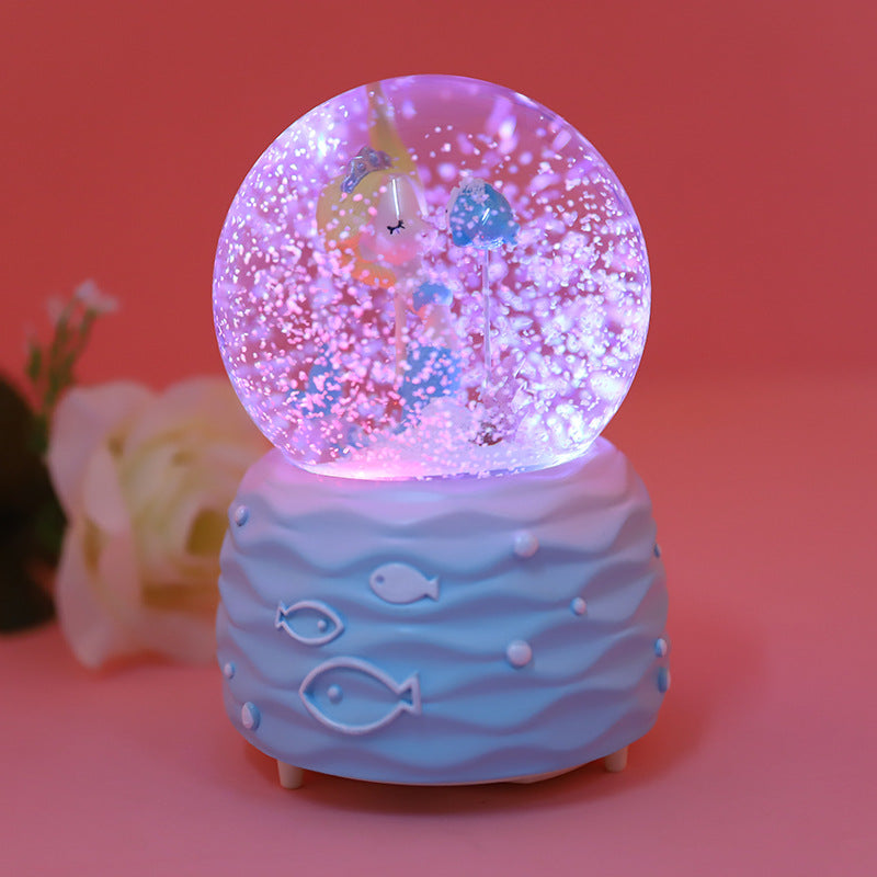 The Enchanting Mermaid Crystal Snow Globe Music Box is not just a music box, but a piece of artwork. It features a beautifully crafted mermaid sitting within a water-clear globe, surrounded by the soft swirl of glitters mimicking ocean snow. With the incorporation of colorful LED lights, the box creates an ambient glow that captivates and enchants. Whether you are celebrating a special occasion like Valentine’s Day or looking for a unique decorative piece, this music box suits all purposes. Its sturdy synthetic resin construction ensures durability while maintaining the attention to detail and artistic beauty. Gift this magical music box to your significant other, family, or friends, and watch their faces light up with joy.