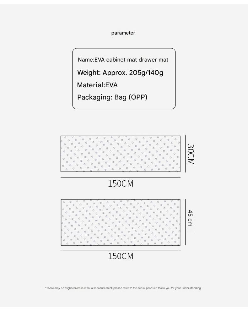 The EVA Drawer Liner is a must-have for anyone looking to keep their drawers and cabinets in top shape. Made from high-quality EVA material, it provides a protective barrier against oil, moisture, and spills. This liner is available in multiple sizes and can be easily cut to fit any space, ensuring a custom fit for your home. Its antimicrobial properties help inhibit the growth of bacteria and mold, making it perfect for kitchens and bathrooms. Simply place the liner in your drawers or on your shelves, and enjoy a cleaner, more organized living space.