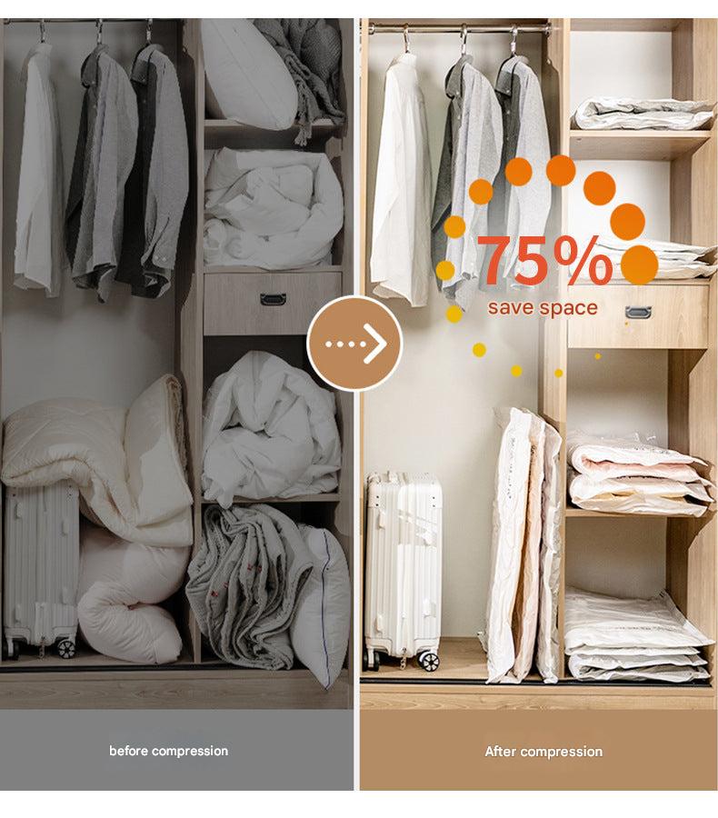 Maximize your storage space with our set of High-Quality Vacuum Storage Bags. Available in various sizes to accommodate everything from small articles like underwear to larger items like duvets and winter clothing. Made from durable PA+PE material, these bags protect against water, moisture, bugs, and dust. Compress items easily without the need for a vacuum or pump, ideal for home use, moving, or travel. Reclaim your closet space with these efficient and compact storage solutions.