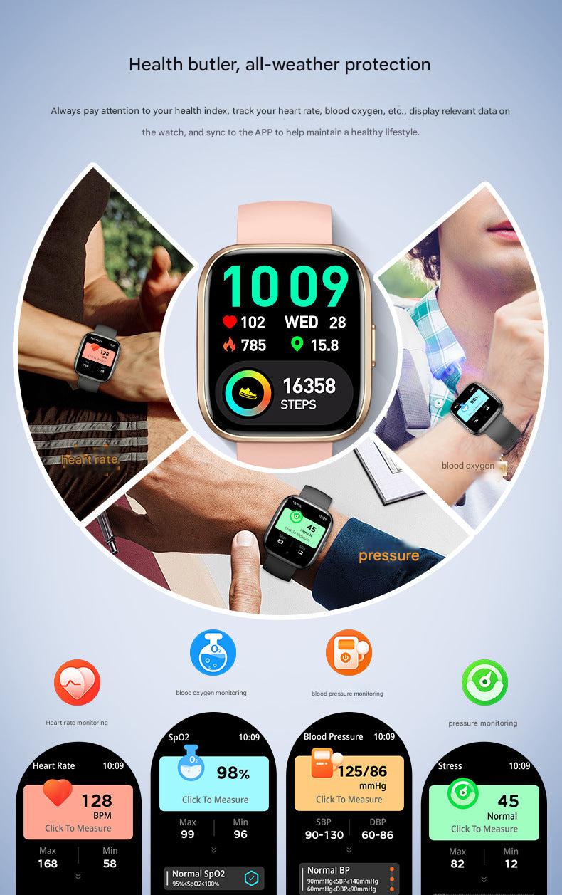 • Comprehensive Health Monitoring: Track your heart rate, blood oxygen levels, and blood pressure in real-time.