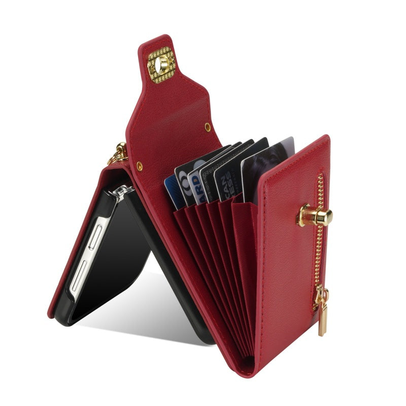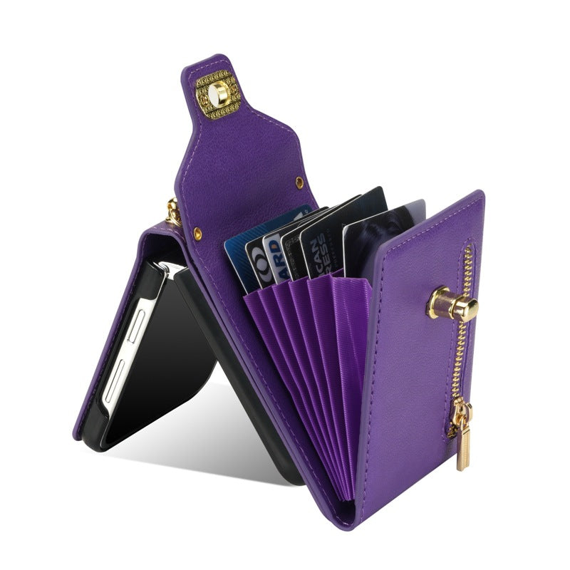 This wallet case features multiple card slots, enabling you to conveniently store your essential cards and cash. The secure zipper closure provides added security, making it perfect for everyday use or travel. With colors available in classic black, stunning rose gold, vibrant green, bold red, and rich purple, you can choose the perfect style that suits your personality.