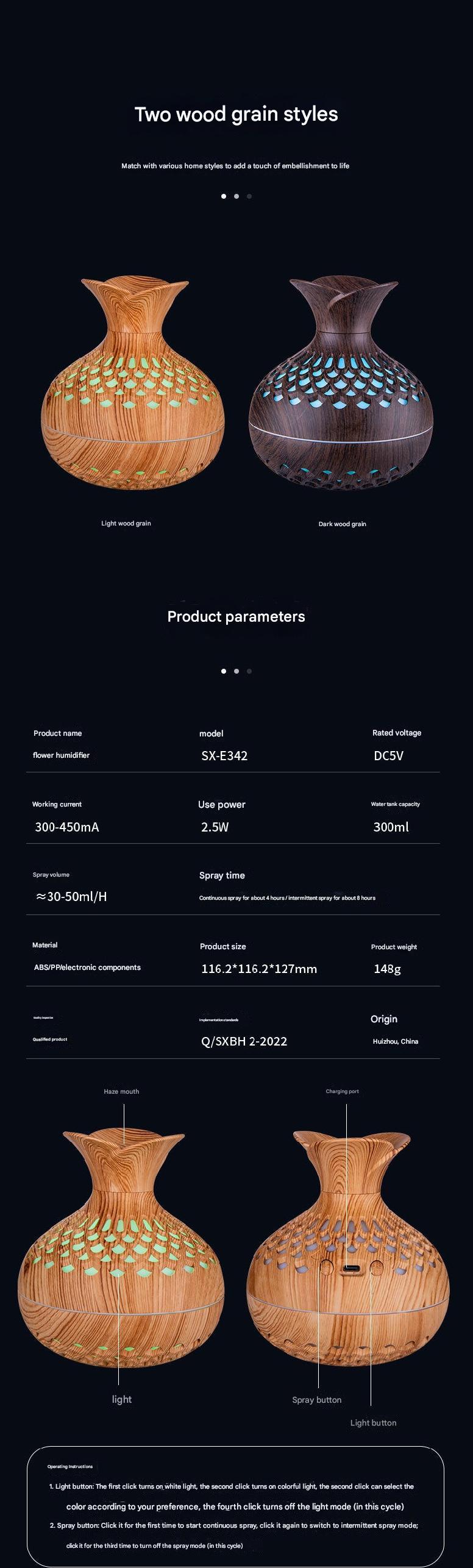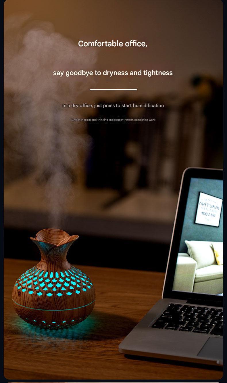 Enhance your indoor air quality and comfort with our Quiet Ultrasonic Humidifier, ideal for spaces up to 10 square meters. This compact and stylish humidifier is designed with a unique wood grain finish that easily complements any room. Featuring quiet ultrasonic technology, it operates silently making it perfect for bedrooms, offices, or any area where noise is a concern. The energy-efficient humidifier runs on USB power and uses only 2.5W, ensuring low electricity consumption. It comes with a 300ml water tank that provides prolonged operation time, reducing the hassle of frequent refills. Along with its functional benefits, it includes a multicolor LED light that can be adjusted to fit the mood, making it a versatile addition to your indoor environment. Use this humidifier to maintain optimal humidity levels, ensuring better air quality and enhanced comfort in your living or work space.