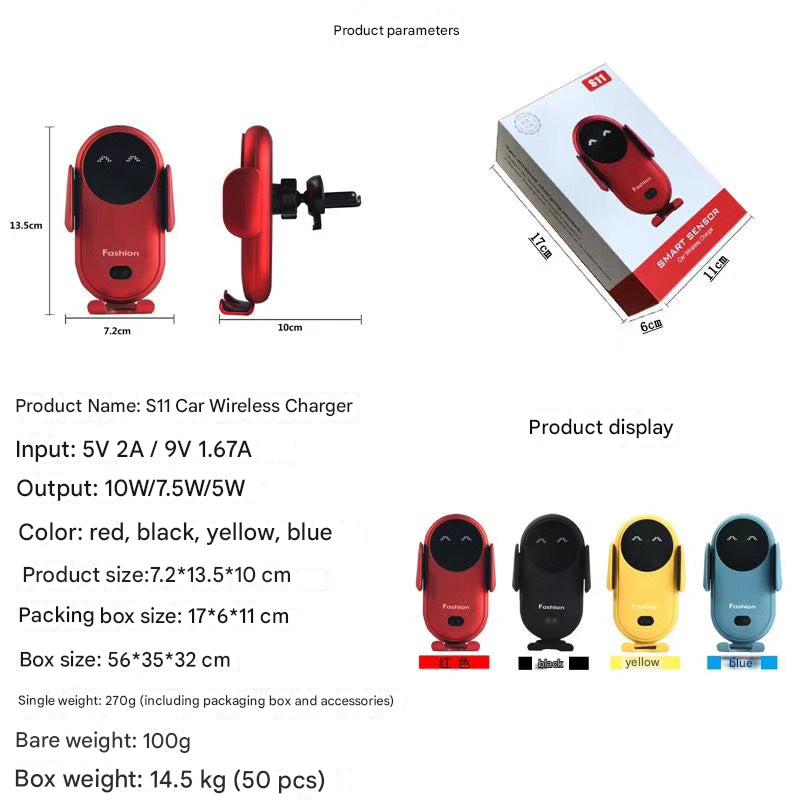 Upgrade your driving experience with the S11 Smart Wireless Charger Car Mount. Equipped with an intelligent infrared sensor that automatically adjusts to your device, it provides fast and secure charging on the go. Suitable for any Qi-enabled smartphones, it supports quick charging up to 10W. The robust suction mount ensures it stays securely attached to your dashboard or windshield. Available in multiple colors, this stylish accessory makes using GPS or handling calls much safer and more convenient while driving.