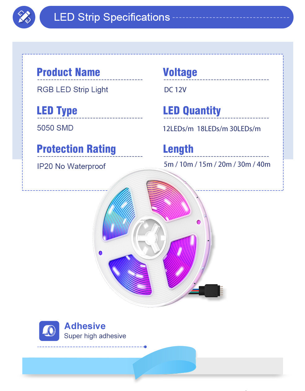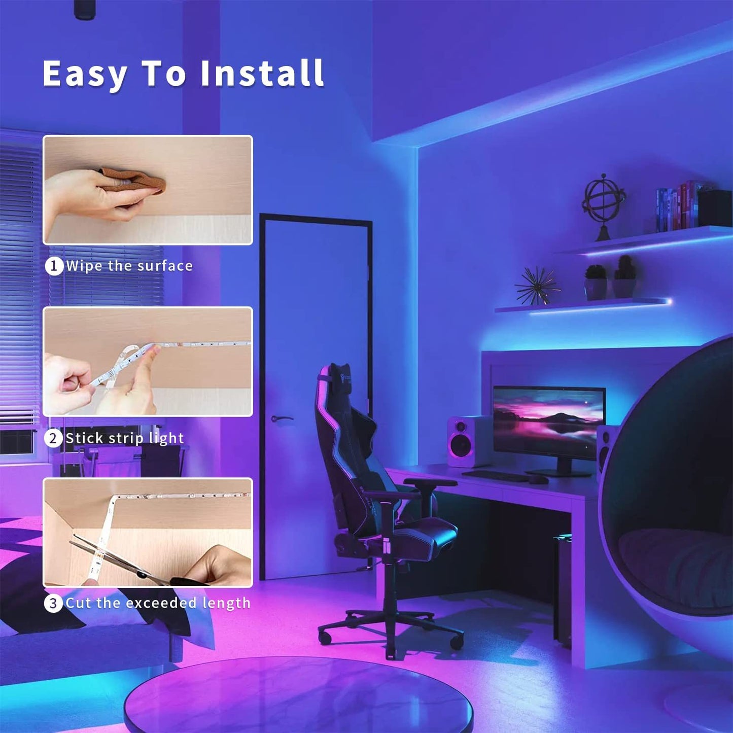 Transform your space with our Smart RGB LED Strip Light Kit. This kit is perfect for adding a splash of color to your TV background, living areas, or outdoor spaces. It features advanced WiFi and Bluetooth connectivity, allowing you to control the lights remotely or sync them with your favorite music. The RGB 5050 LED technology provides a full spectrum of colors, bringing vibrant life to any environment. With an IP65 rating, the lights are waterproof and suitable for outdoor use. Energy efficiency is paramount, as the system operates on a low 12V, making it both safe and cost-effective. Installation is a breeze with the included adhesive backing. Customize your lighting experience with multiple control modes, including a smart app and a remote control.